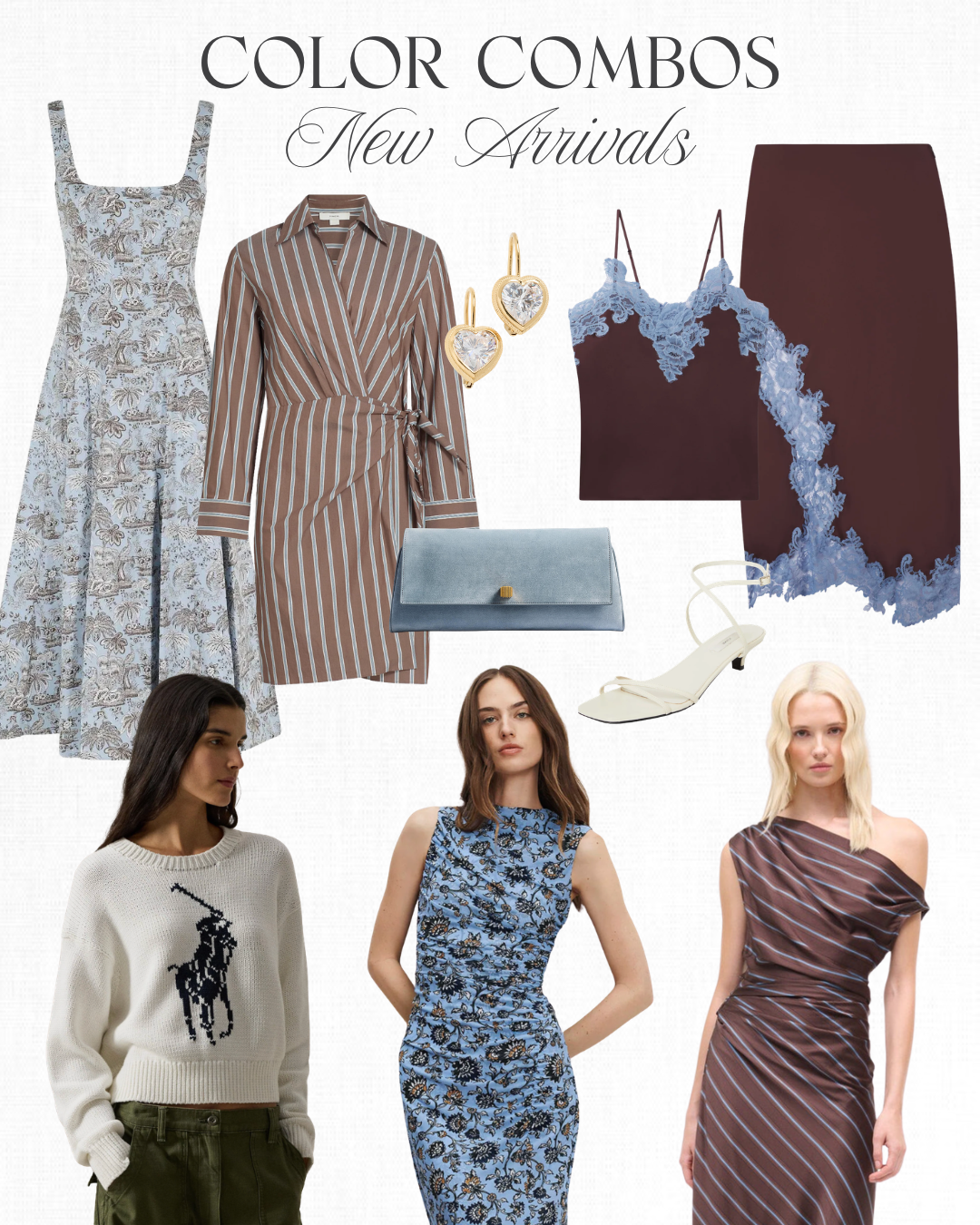 Staud dress | Brown striped dress | Earrings | Clutch | Lace tank & matching skirt | Heels | Polo sweater | Blue printed dress | Brown satin dress