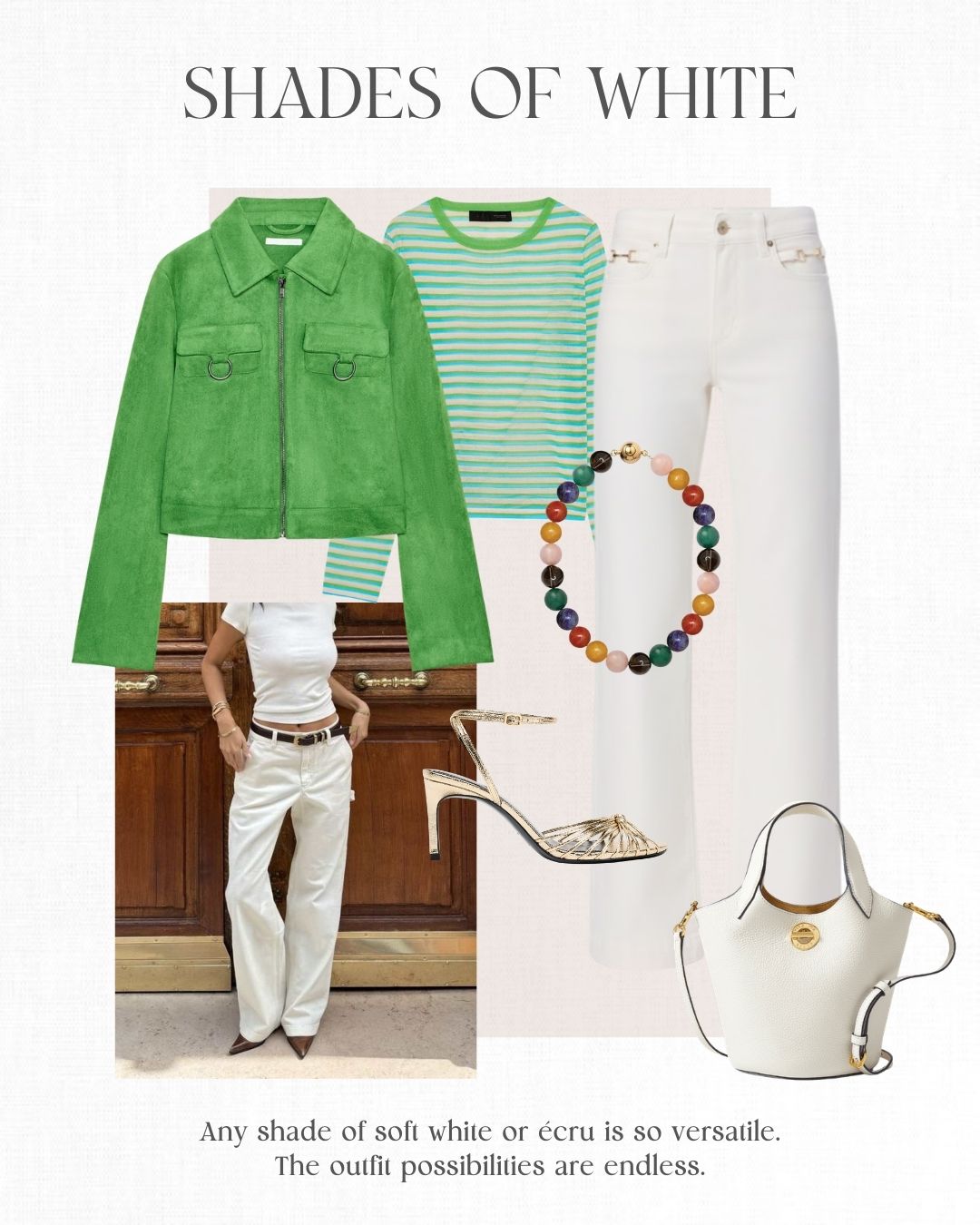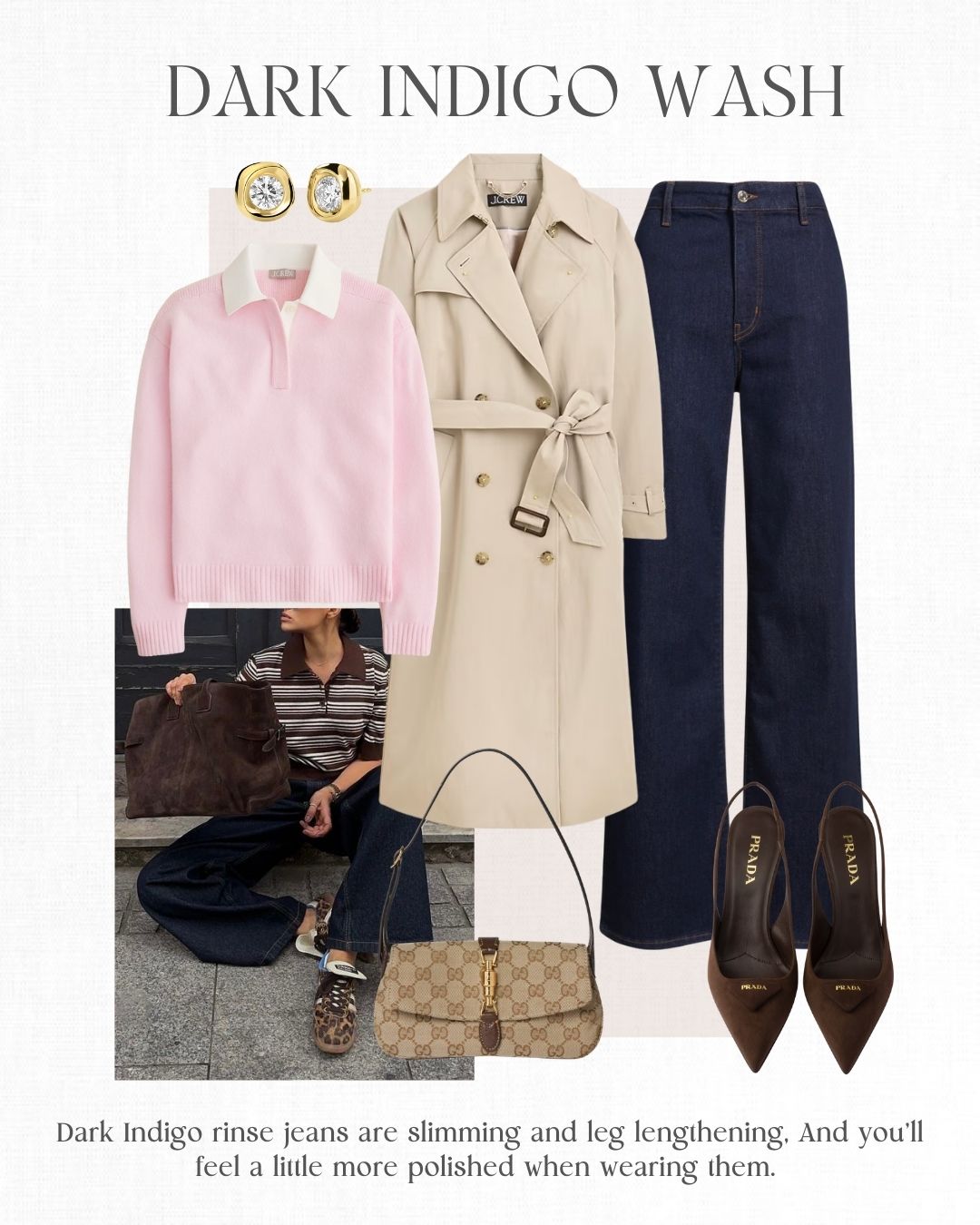 - Lightweight cashmere sweater or cardigan | Stylish sneakers | Modern denim | Neutral shoes