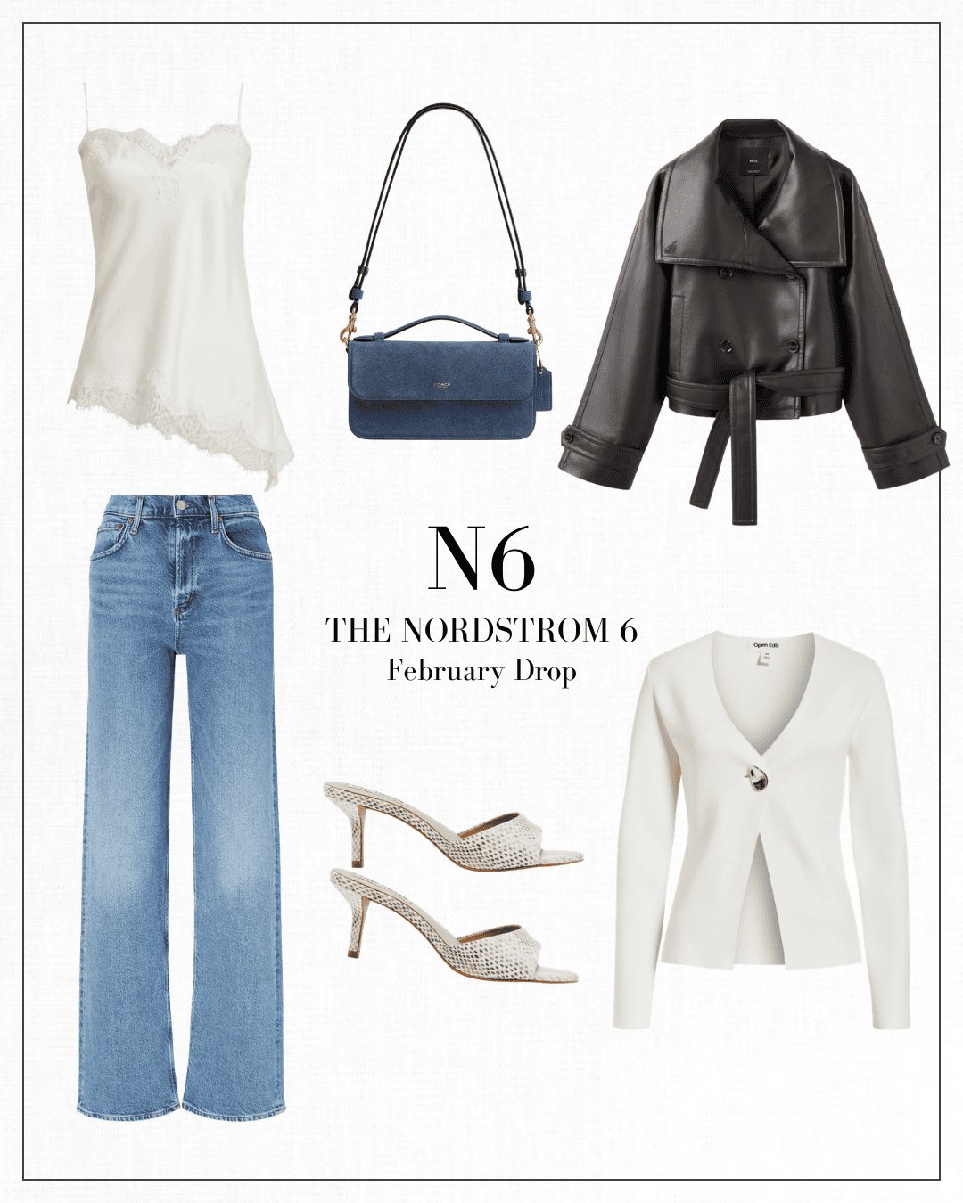 Nordstrom Drop: Open Edit lace cami | Mango leather jacket | Agolde jeans | Open Edit sweater | Coach bag | Steve Madden sandals