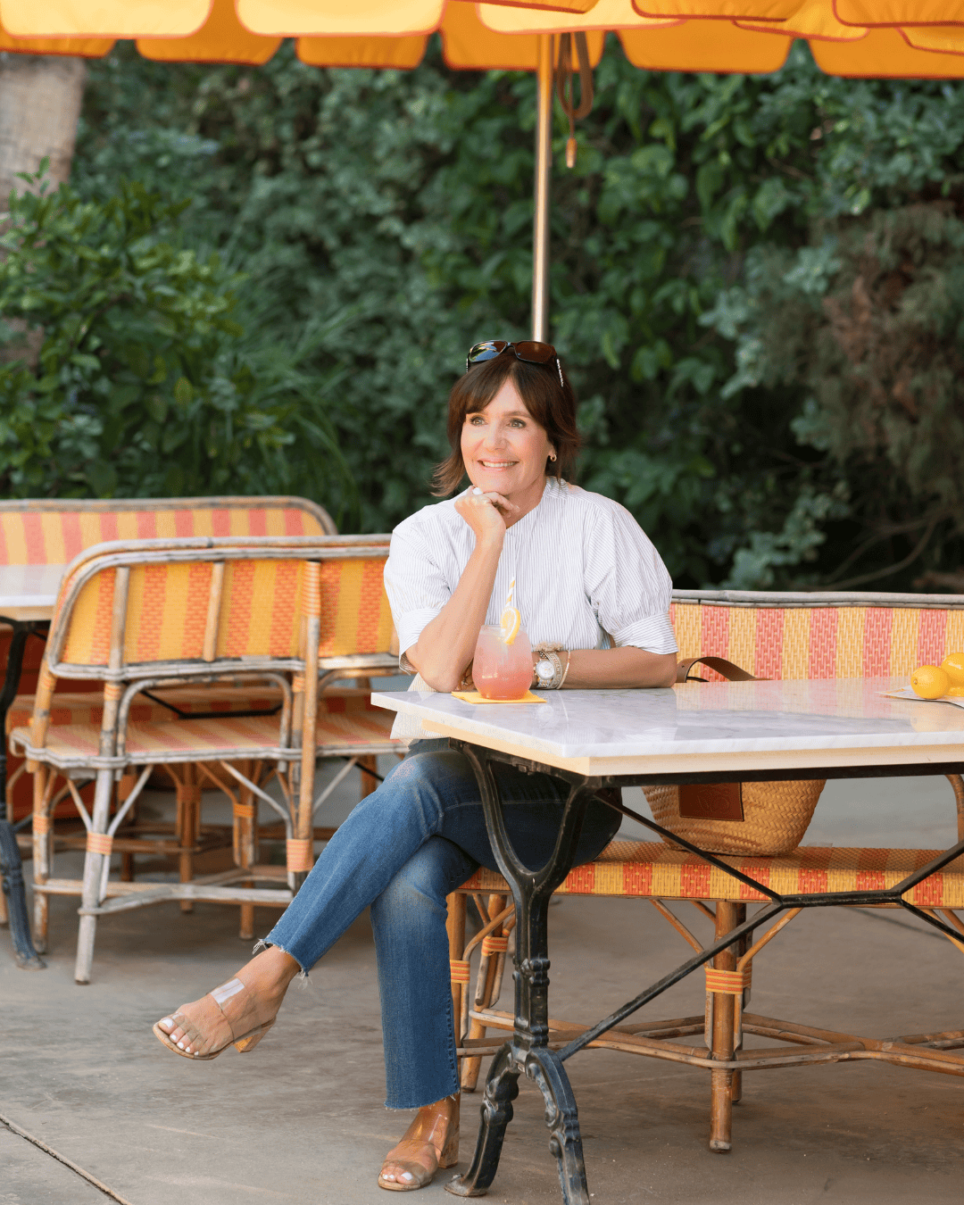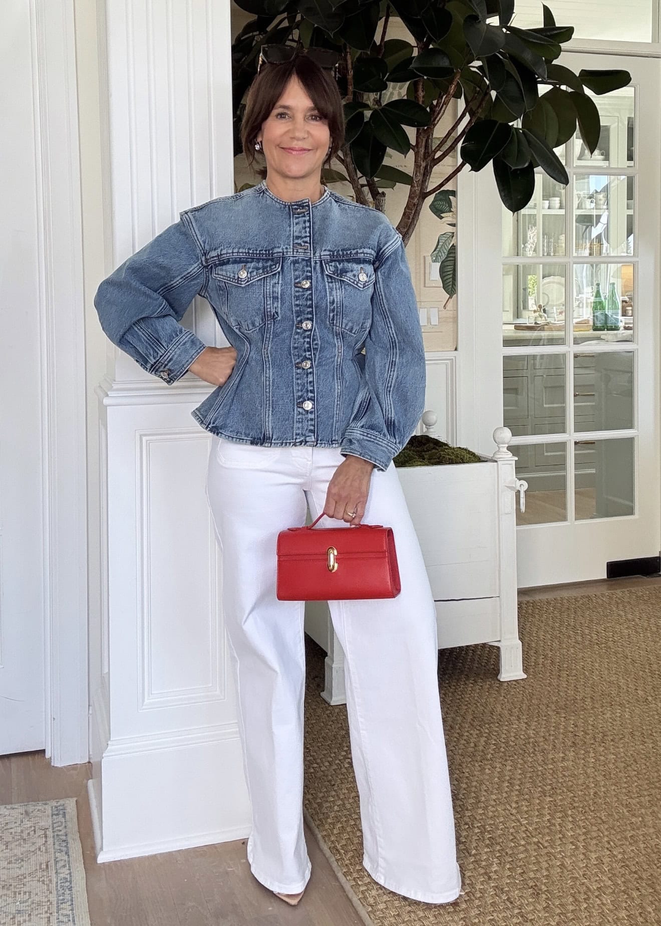 Susie: Frame denim jacket | White jeans | Red bag | Rolling rack: See the video here, and shop everything here