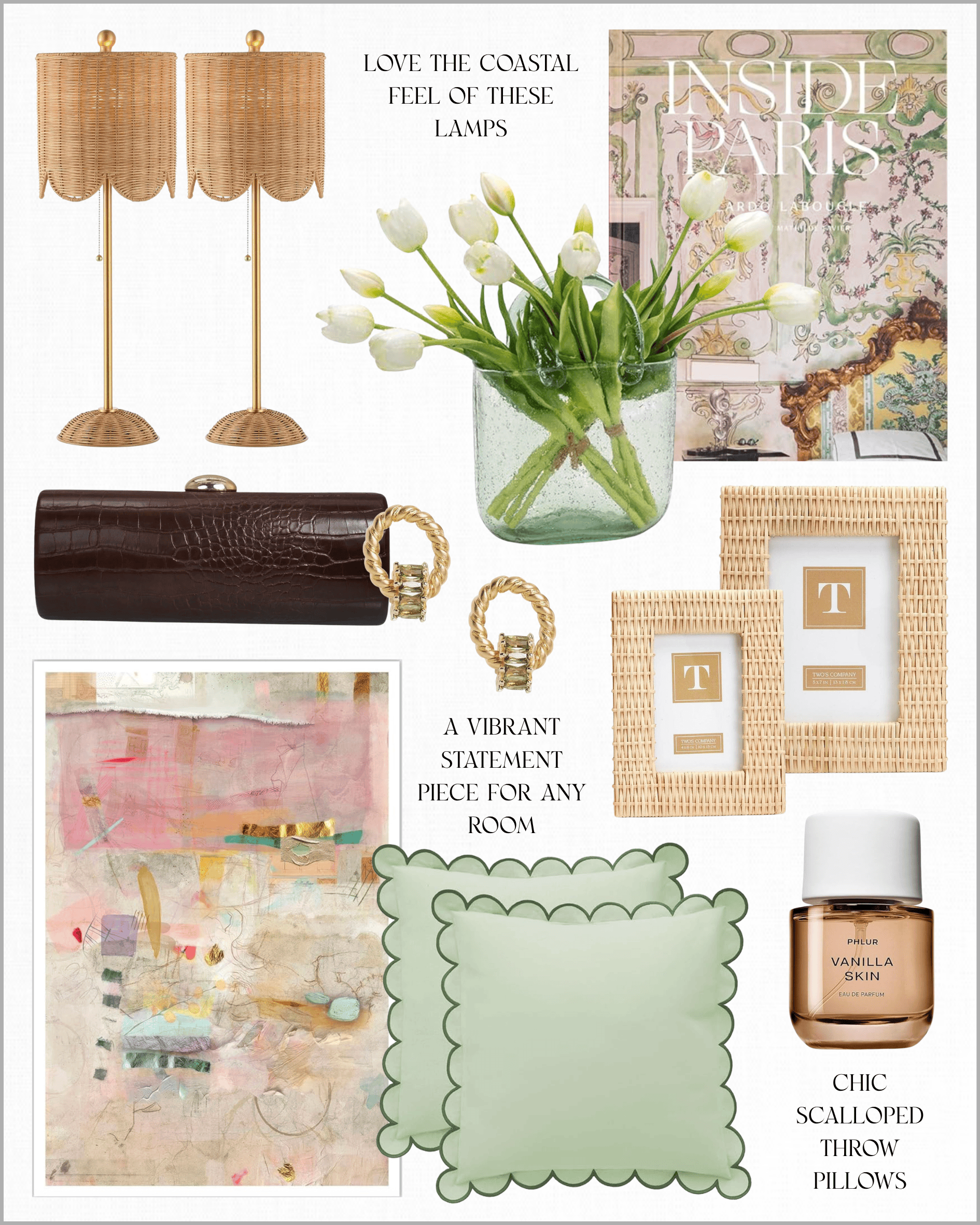 Rattan lamps | Faux flowers | Inside Paris book | Clutch | Earrings | Picture frames | Print | Pillows | Phlur perfume