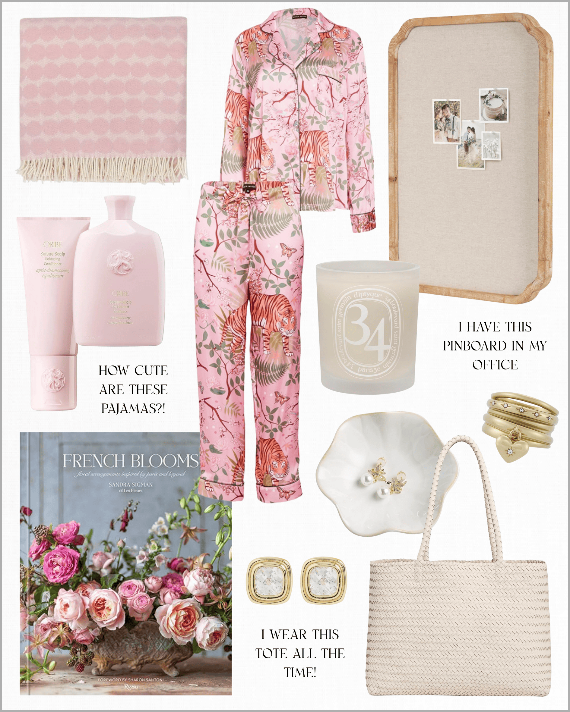Blanket | Pajama set, more colors here | Bulletin board | Shampoo & Conditioner | Candle | Book | White dish | Ring | Earrings | Woven tote