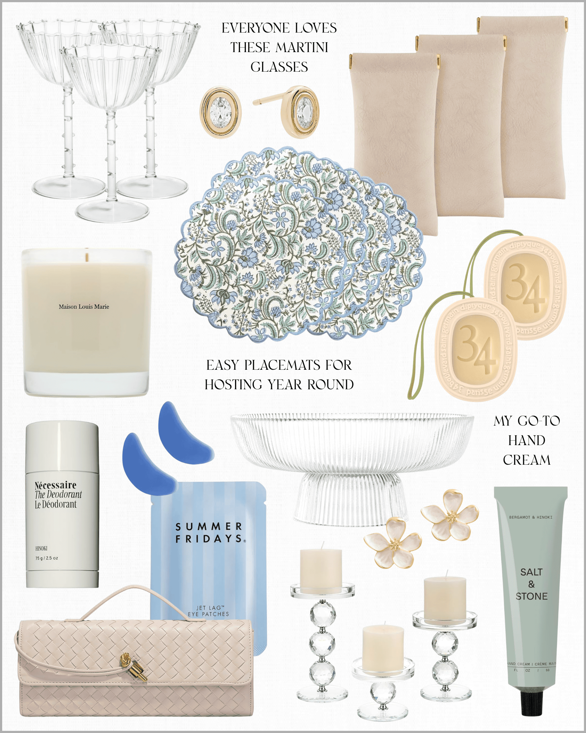 Glasses | Earrings | Sunglass sleeve | Placemats | Candle | Diptyque scented oval | Deodorant | Eye mask | Glass bowl | Flower earrings | Clutch | Candle sticks | Hand lotion