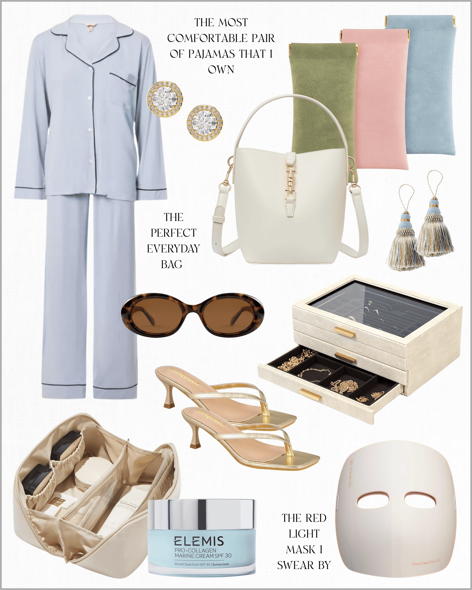 Pajama set | Earrings | Sunglasses sleeve | Ivory bag | Tassels | Sunnies | Jewelry box | Sandals | Makeup bag | Elemis marine cream | Red light mask
