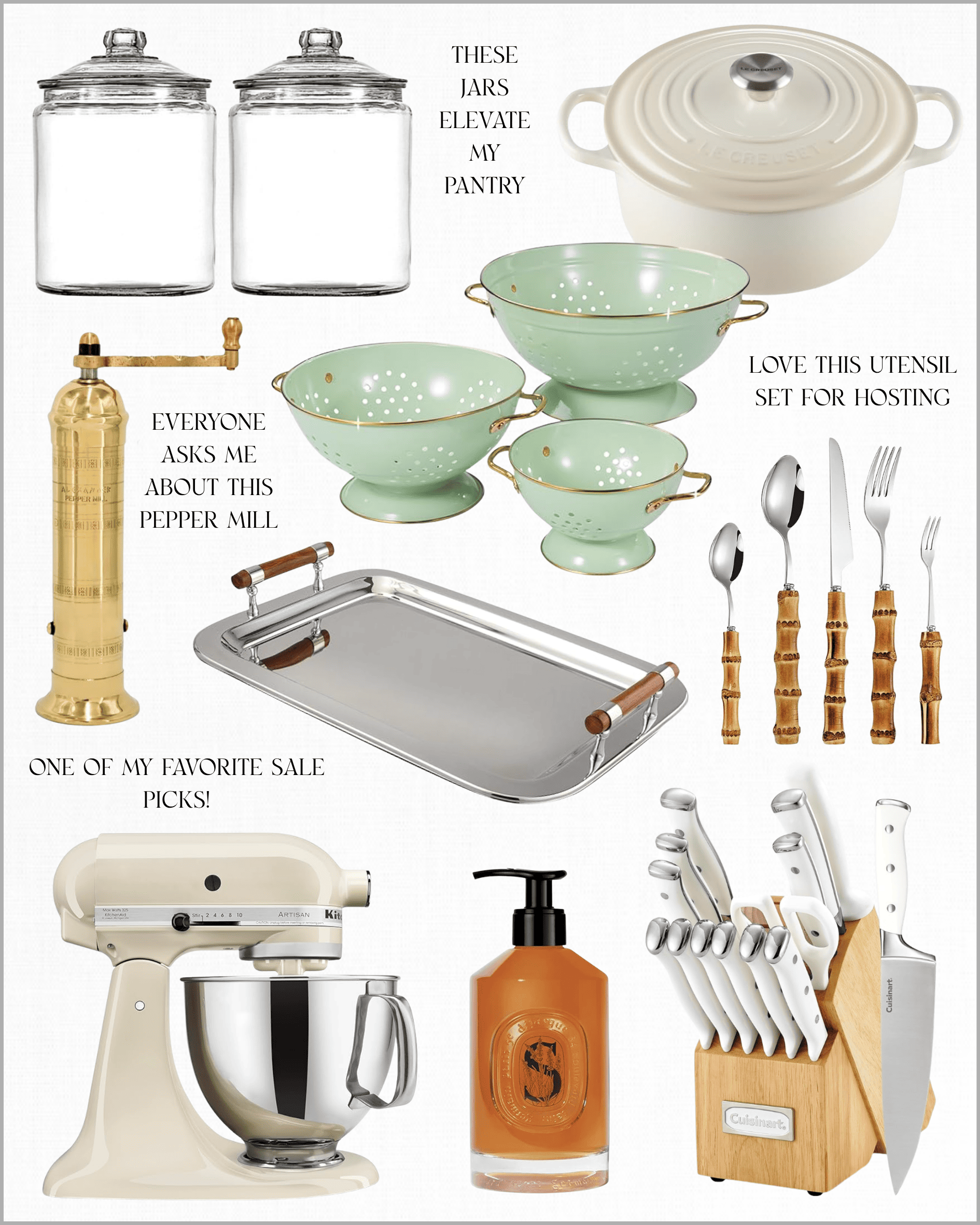 Glass jars | Le Creuset pot | Pepper mill | Colander set | Silver tray | Bamboo cutlery | Kitchen Aid mixer | Diptyque soap | Knife set