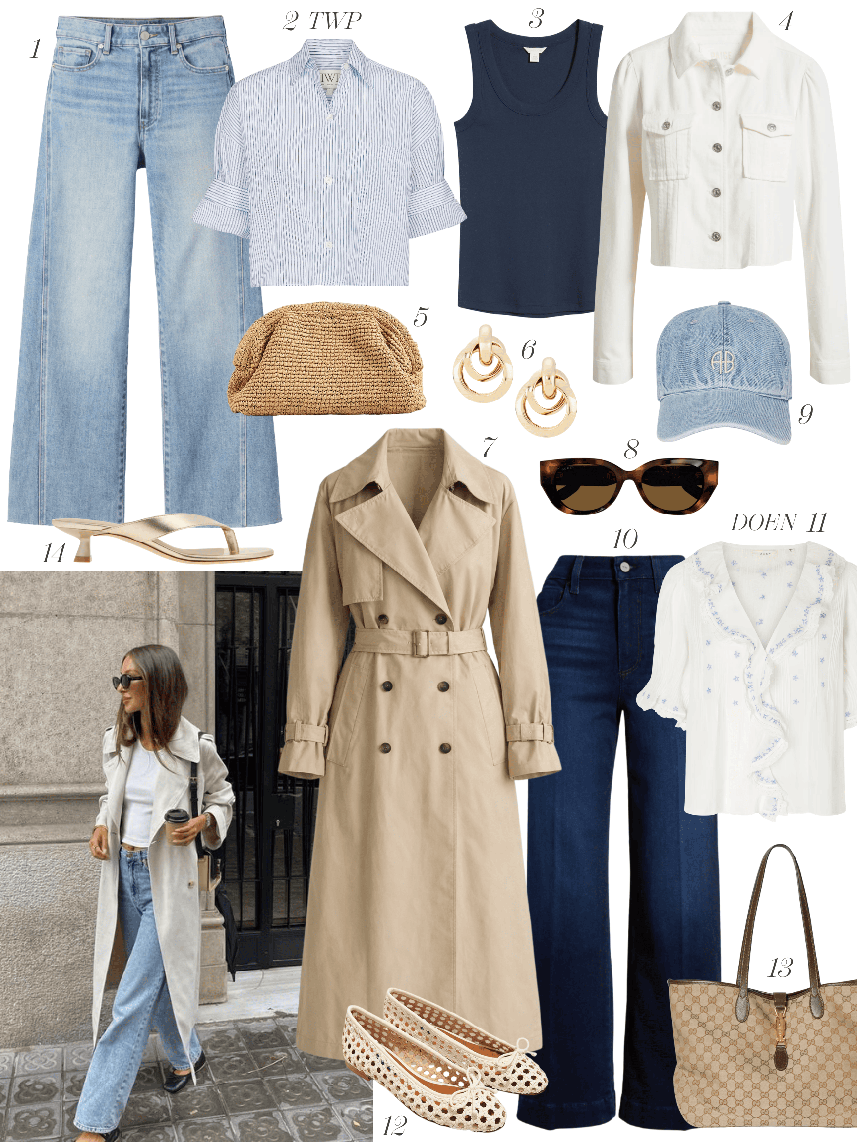 Left: Sweater | Blouse | Jeans | Earrings | Raffia bag | Sandals | Right: Trench | Sweater | Jeans | Handbag | Heels