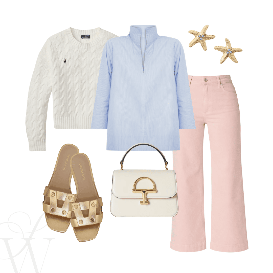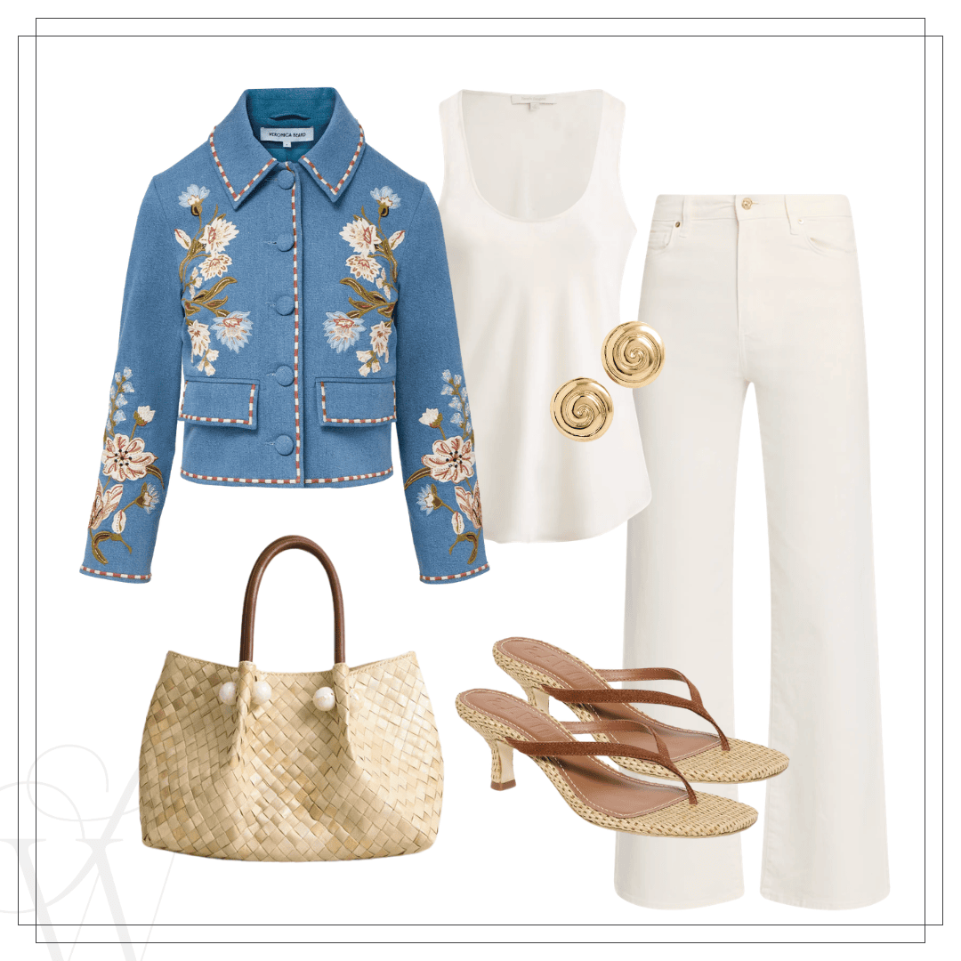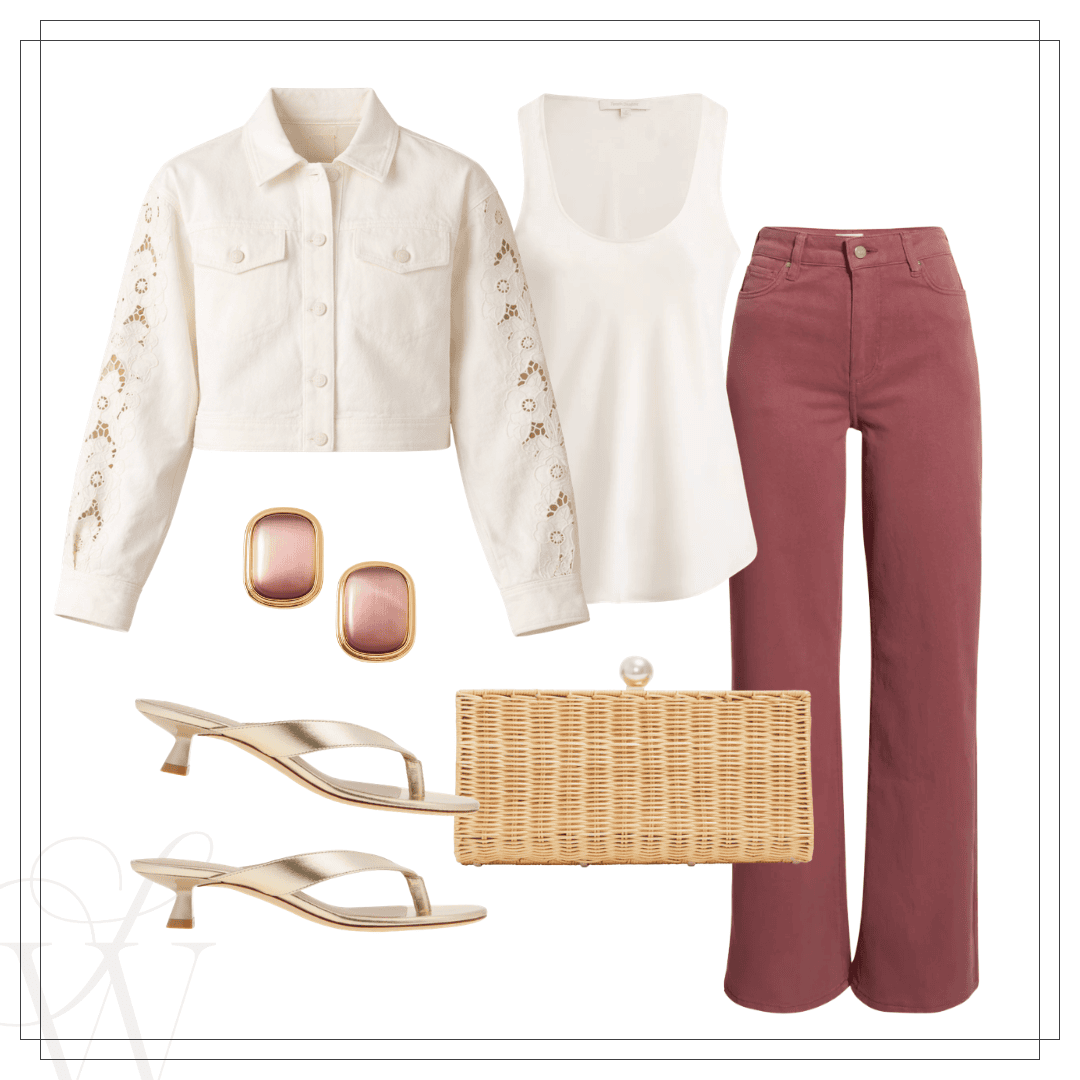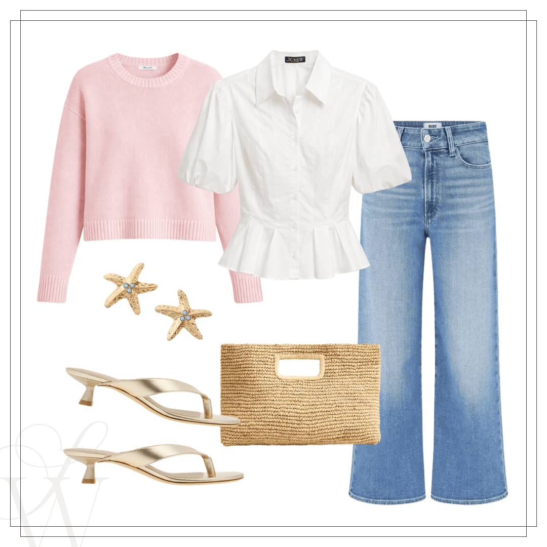 Left: Polo sweater | Blouse | Jeans | Sandals | Handbag | Earrings | Right: Eyelet jacket | Satin tank | Jeans | Sandals | Earrings | Clutch
