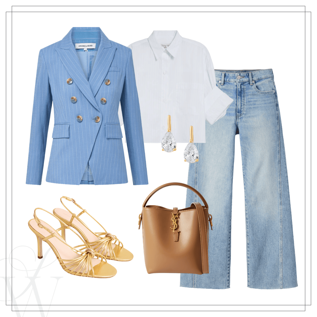 Left: Ecru jeans | Jacket | Satin tank | Handbag | Heels | Earrings | Right: Blue jeans | Blazer | Button-up | YSL handbag | Earrings | Sandals