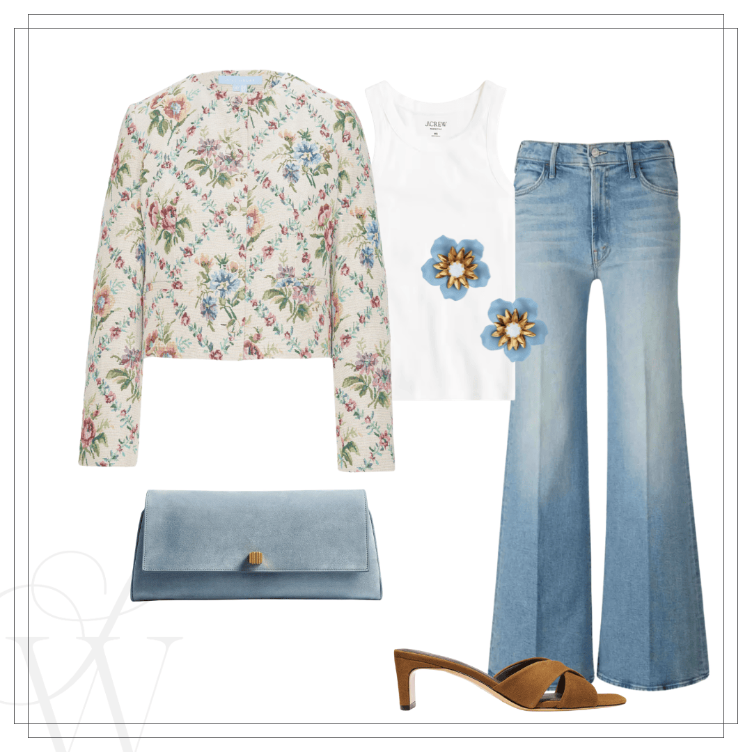 Left: Blazer | Dress | Clutch | Earrings | Sandals | Right: Denim jacket | Tank | Mother jeans | Zara bag | Sunglasses | Sandals