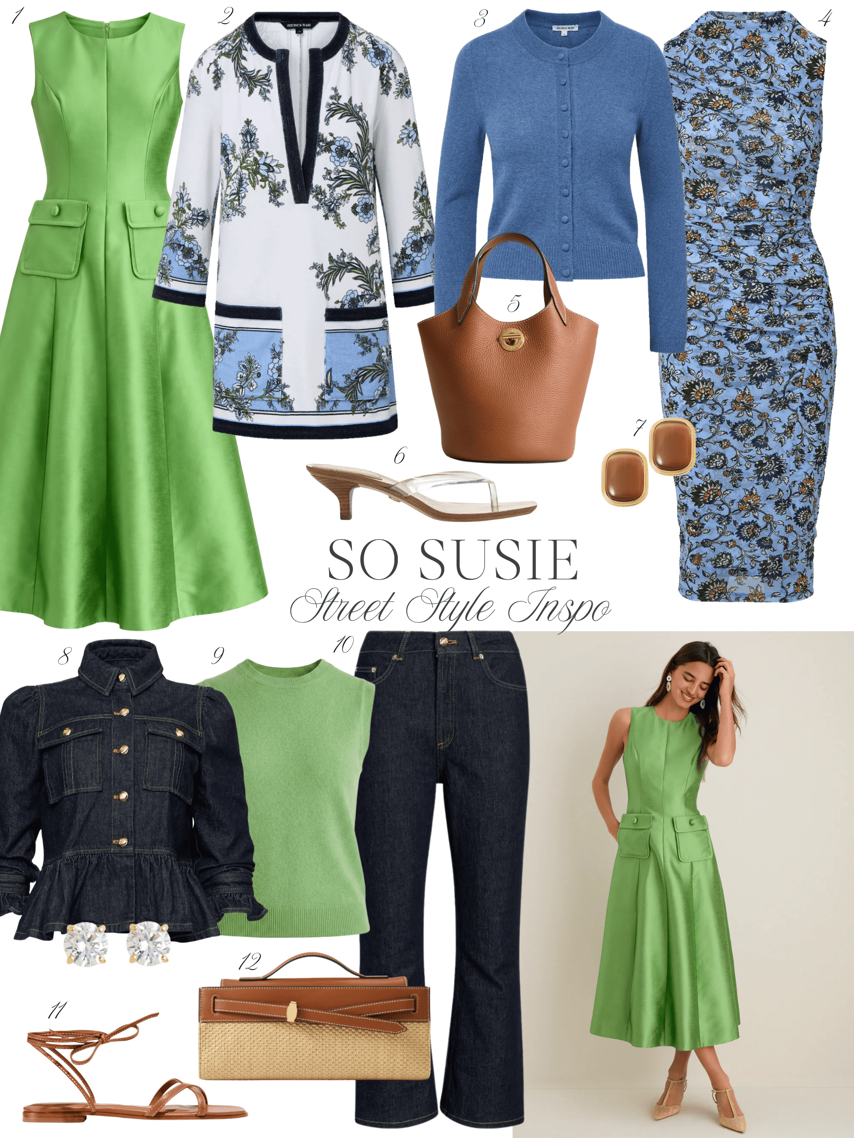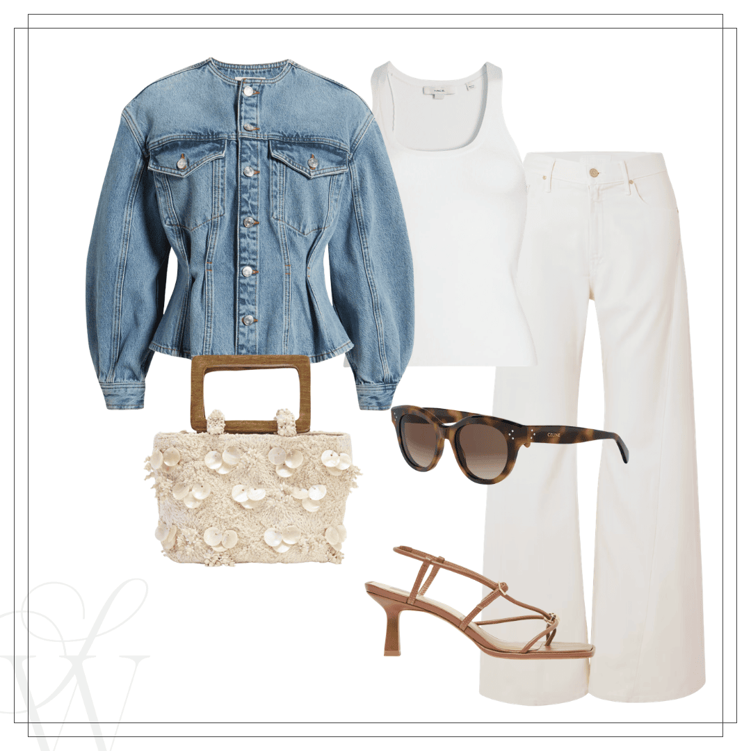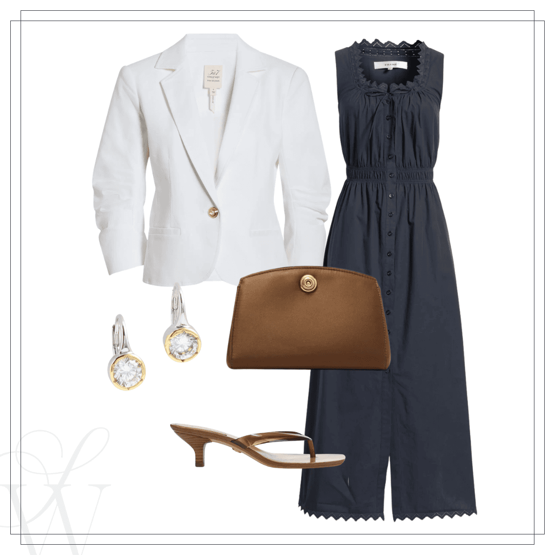 Left: Blazer | Dress | Clutch | Earrings | Sandals | Right: Denim jacket | Tank | Mother jeans | Zara bag | Sunglasses | Sandals