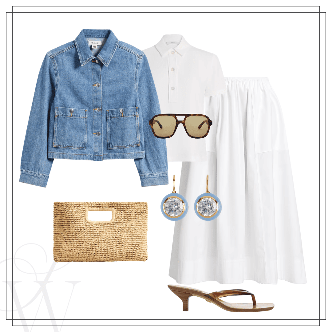 Left: Brocade jacket | Tank | Jeans | Clutch | Earrings | Sandals | Right: Denim jacket |White polo | Cotton skirt | Jelly sandal | Clutch | Earrings | Sunnies