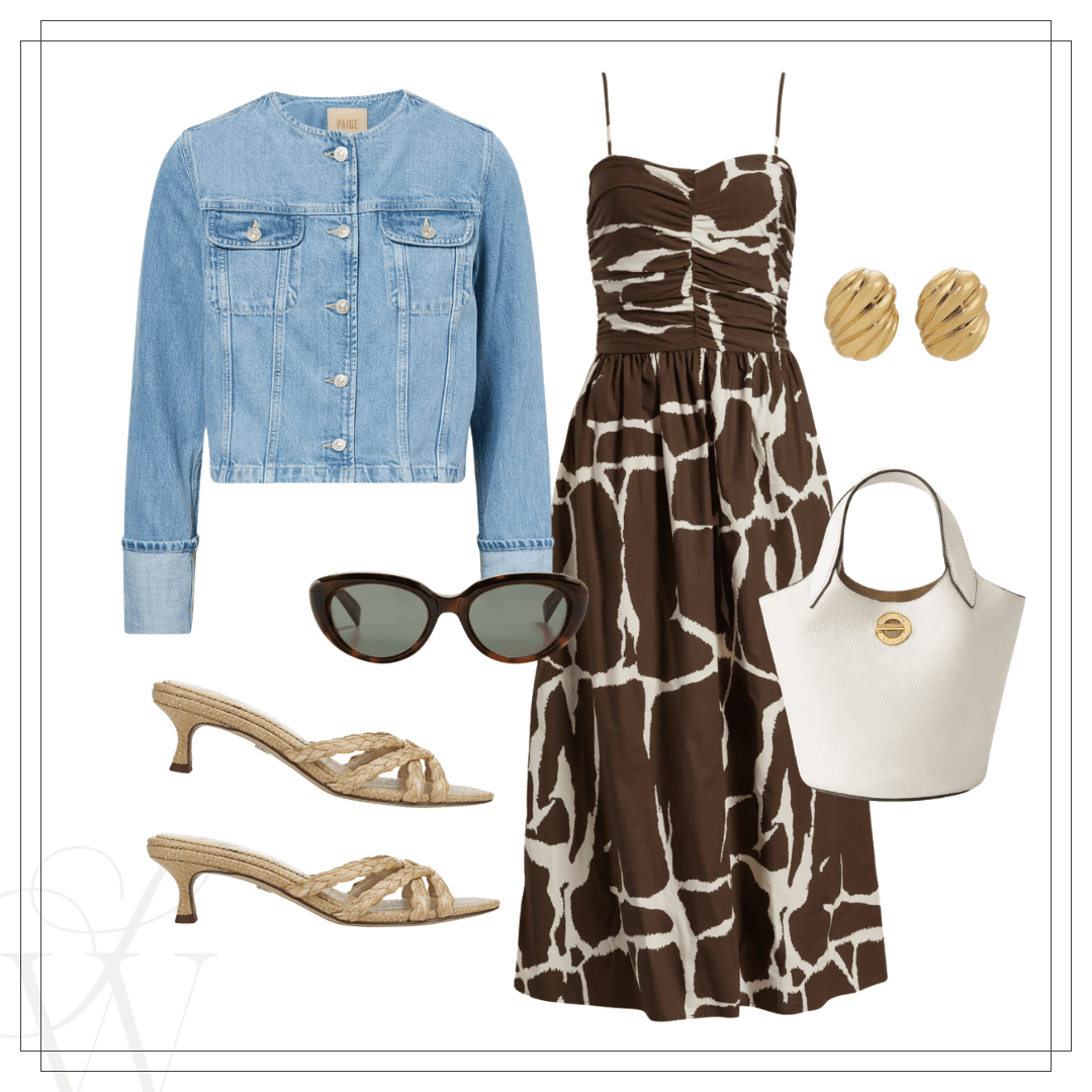 Left: Denim jacket | Rails brown midi dress | Sandals | White bag | Earrings | Right: Cardigan | Blue dress | Sandals | Straw bag | Earrings
