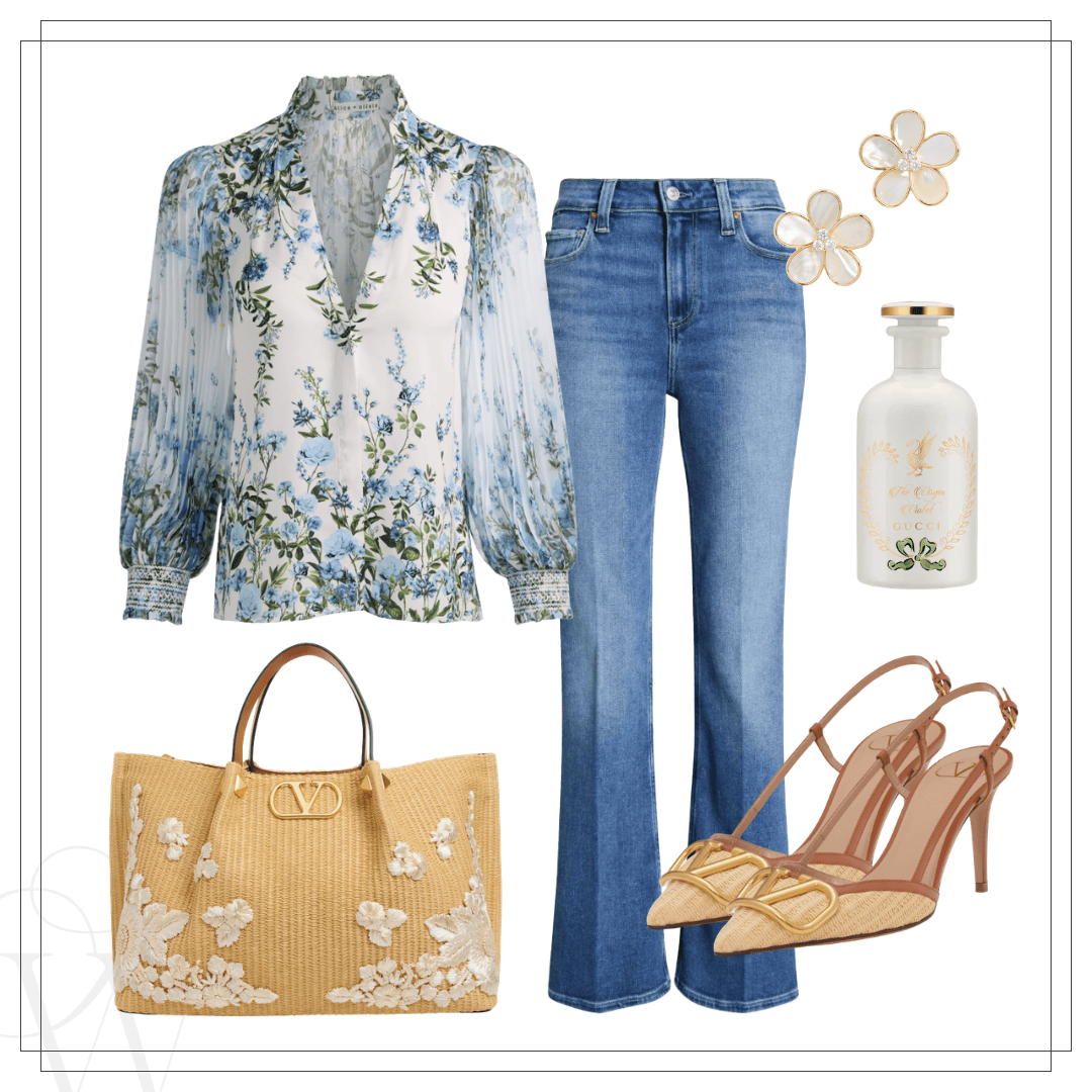 Left: Alice & Olivia blouse | Jeans | Valentino bag | Slingbacks | Earrings | Right: Cardigan | Frame top | Jeans | Clutch | Necklace | Sandals
