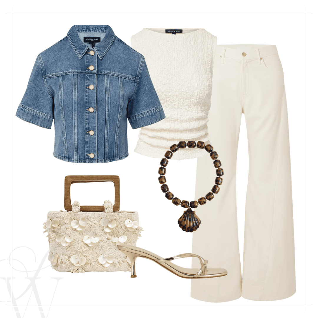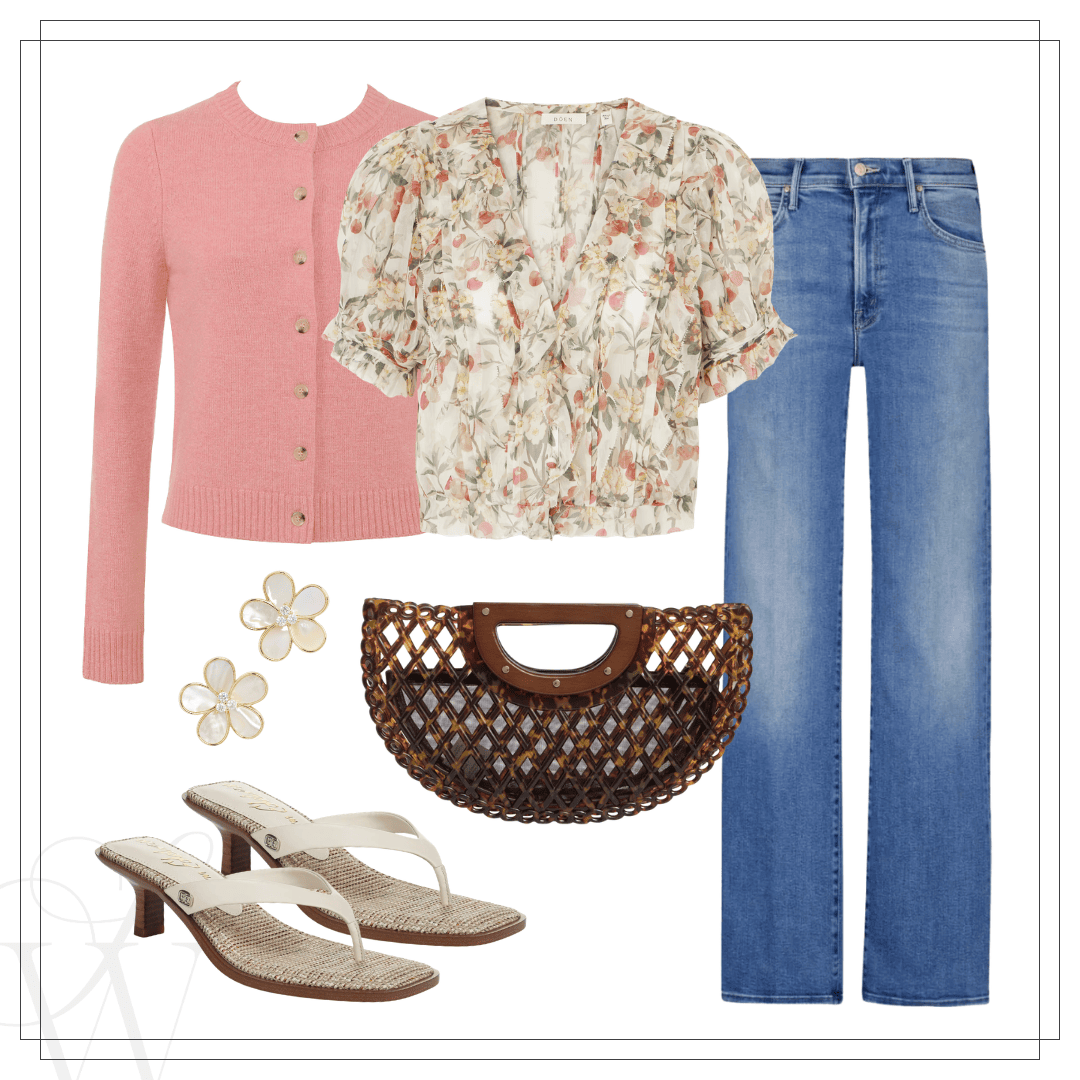 Left: Denim jacket | Tank | Ecru jeans – petites here | Sandals | Bag | Necklace | Right: Cardigan | Blouse | Jeans | Sandals | Clutch | Earrings