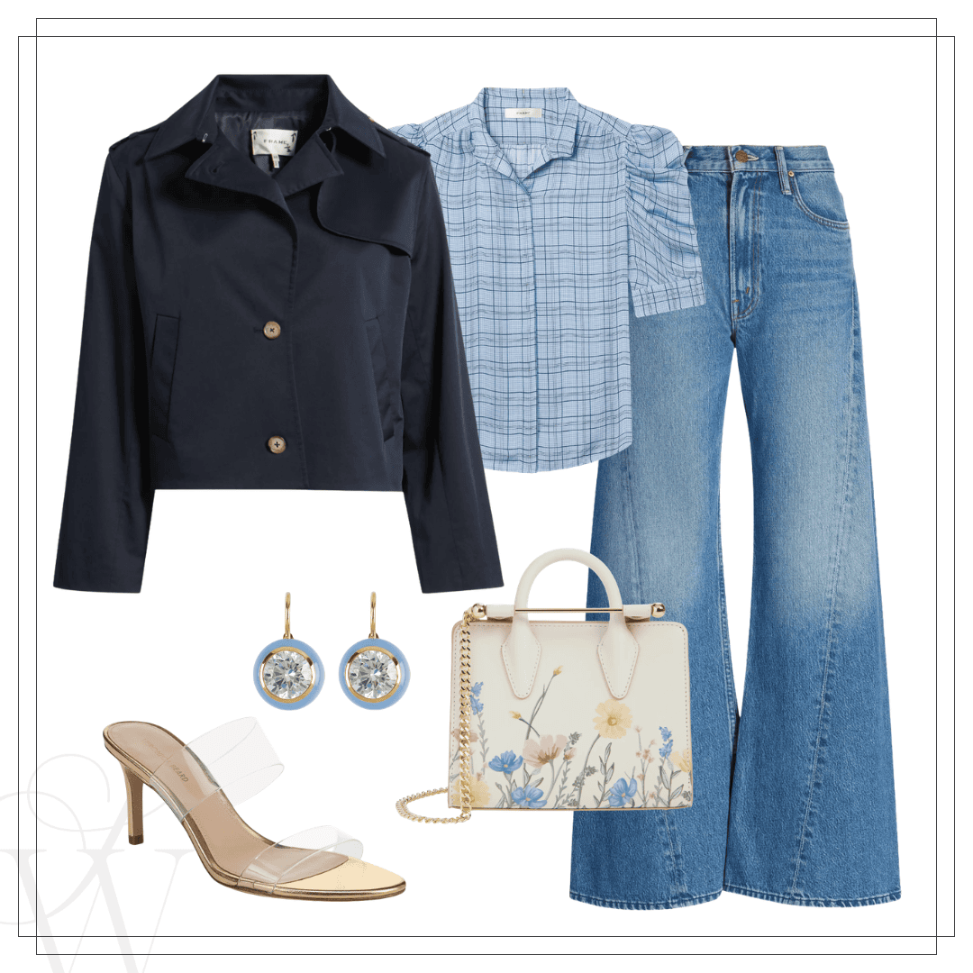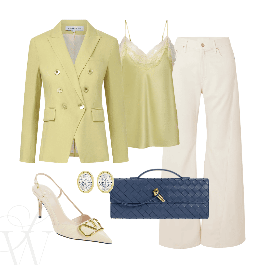 Left: Crop trench | Blouse | Jeans | Bag | Earrings | Sandals | Right: VB blazer | Cami | Jeans | Clutch | Slingbacks | Earrings