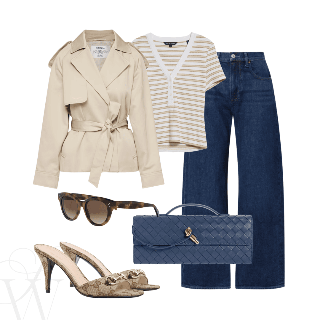 Trench jacket | Stripe tee | Barrel jeans | Sunglasses | Gucci sandals | Bottega clutch