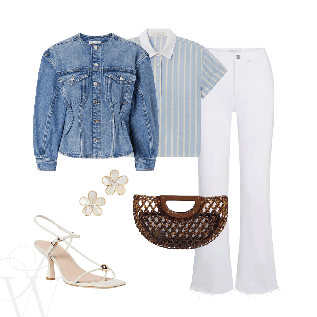 Frame denim jacket | Stripe top | White Lax jeans – petites here | Sandals | Earrings | Jelly clutch