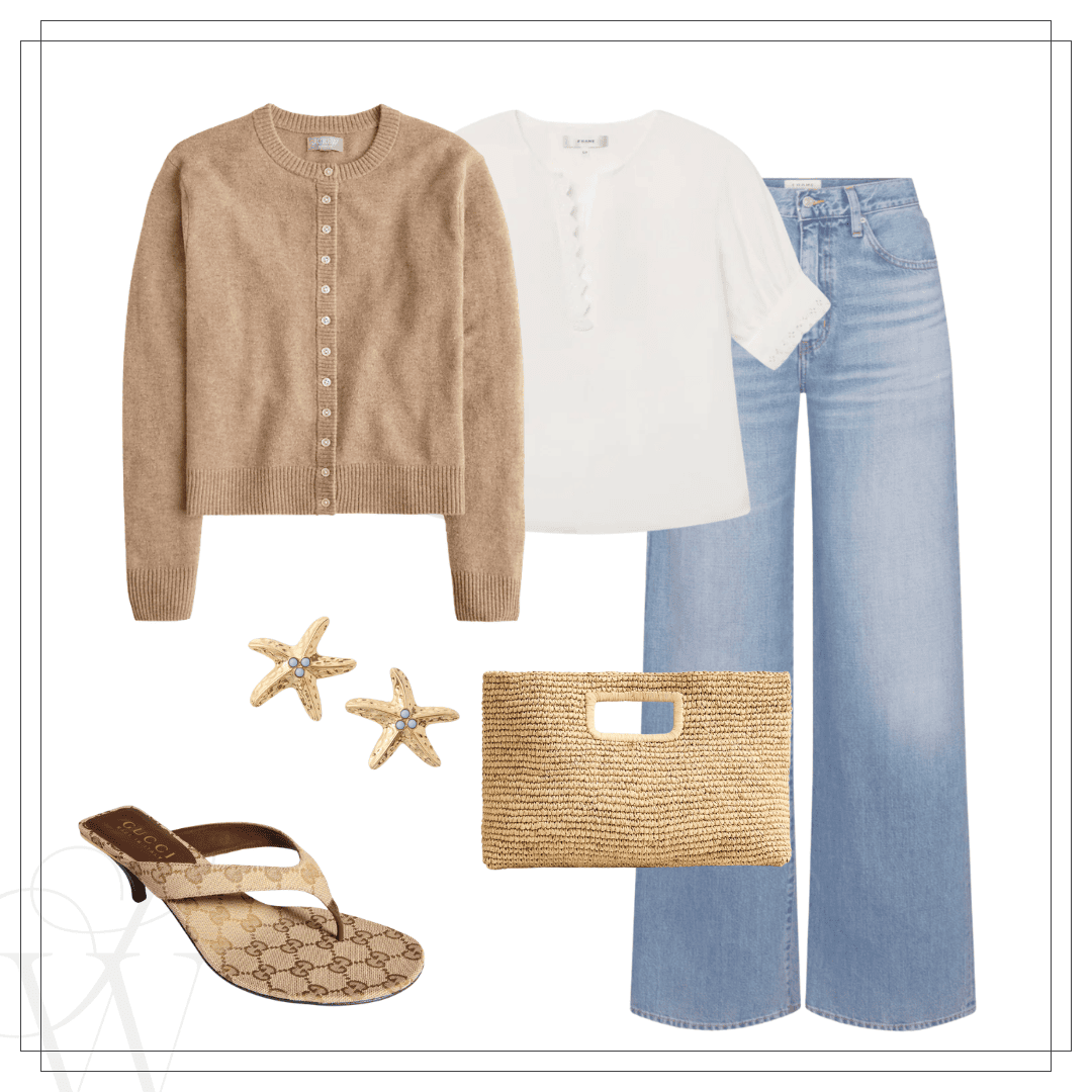 J.Crew cardigan | Frame eyelet popover top | Frame Off-Duty Stroll jeans | Gucci sandals | Earrings | J.Crew clutch