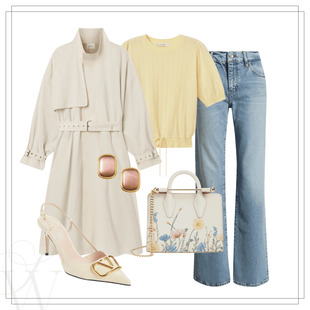 Frame trench, coming soon | Yellow sweater | Frame Rodeo jeans | Slingbacks | Earrings | Bag