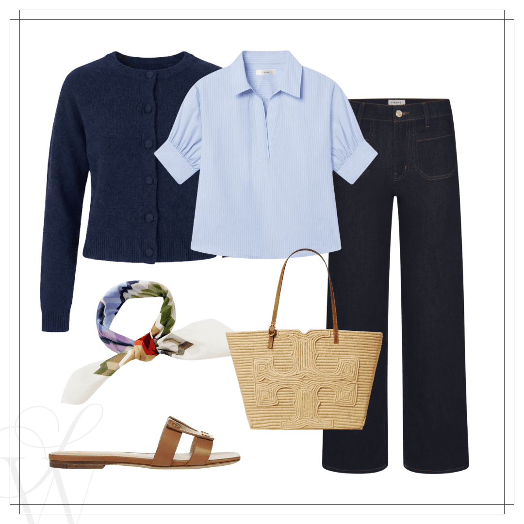 Cardigan | Blue shirt | Le Slim Palazzo jeans | Scarf | Sandals | Tory Burch bag