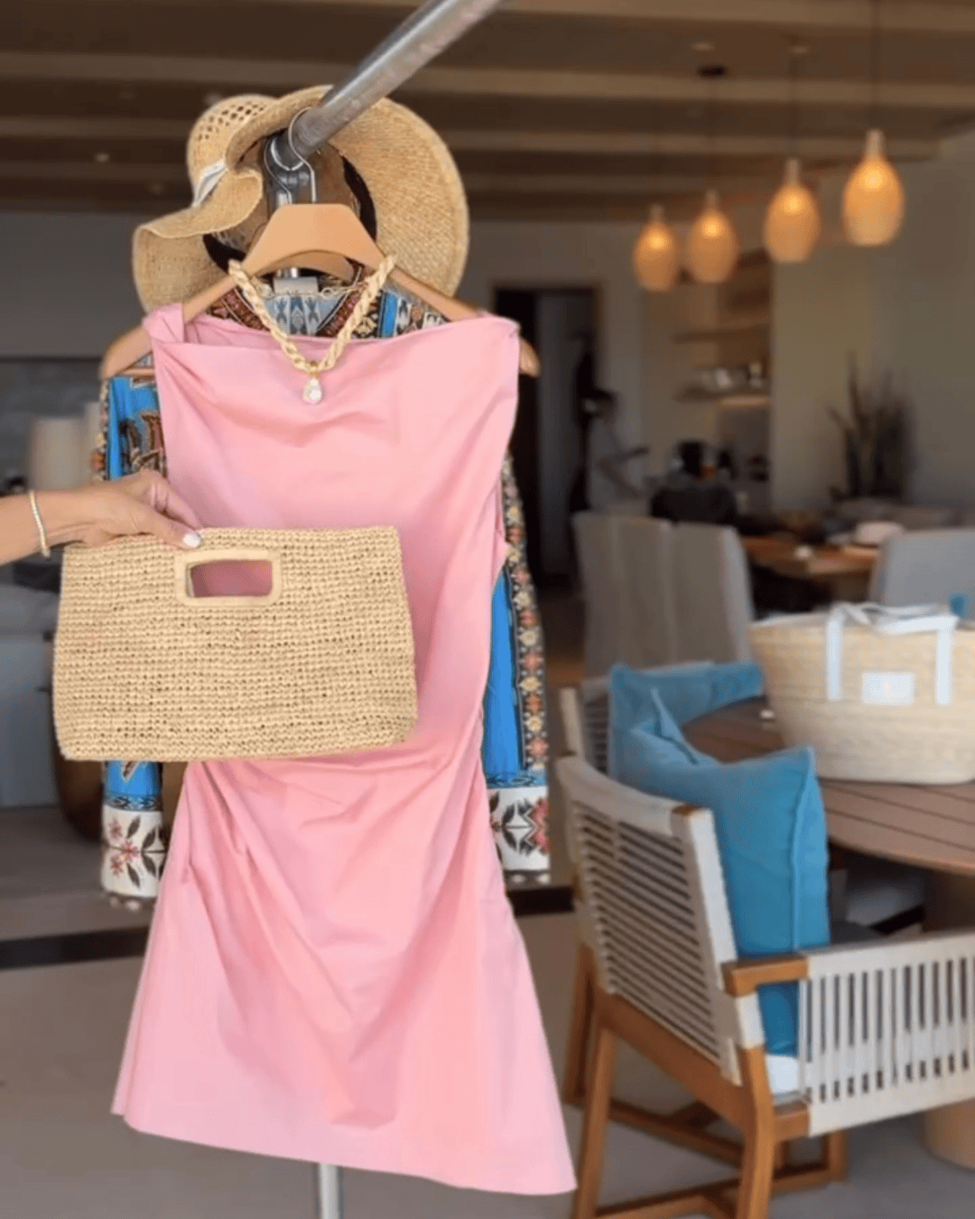 Left: Frame blouses | Right: Staud dress | Raffia clutch