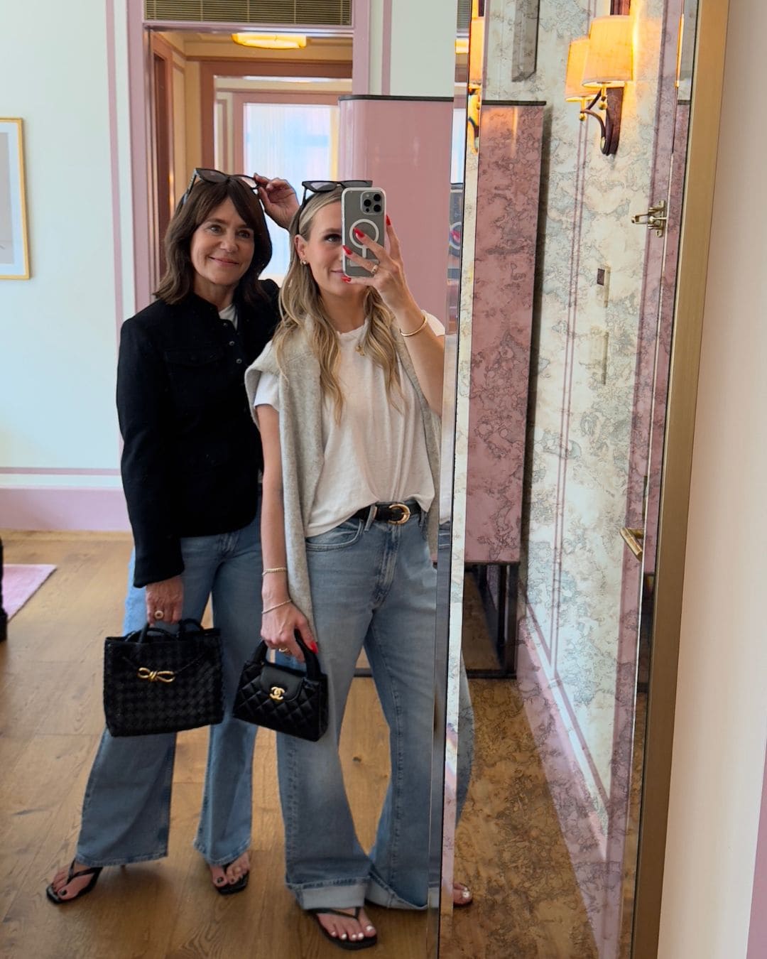 #7 – Katie Kime Pajamas – When I spotted these cute toile pattern ones with a NYC print, I knew we’d be twinning in our hotel room. Then, I noticed Nordstrom has started carrying the line. There are a handful of cities with cute toile pattern prints — check them all out here and let me know which one is your favorite!#8 – Amazon Bottega bag & the real Bottega bag – These are Amazon finds that are really good, and I even wrote about some save/splurge items in this recent post. I splurged on this bag several years ago, and it has been a go-to for me. Then Emily showed up with one! Just today, someone asked me if the quality is good. My answer is yes — it’s surprisingly good, and I think it’s worth every penny. Forgot to mention that we both purchased this horizontal clutch as well.