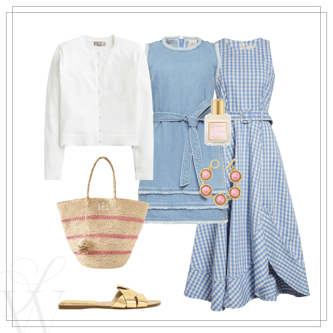 Left: Denim dress, similar – affordable version here | Sandals | Dior bag | Right: Denim shorter dress | Gingham midi dress | Sandal | Straw bag | Bracelet | Cardigan