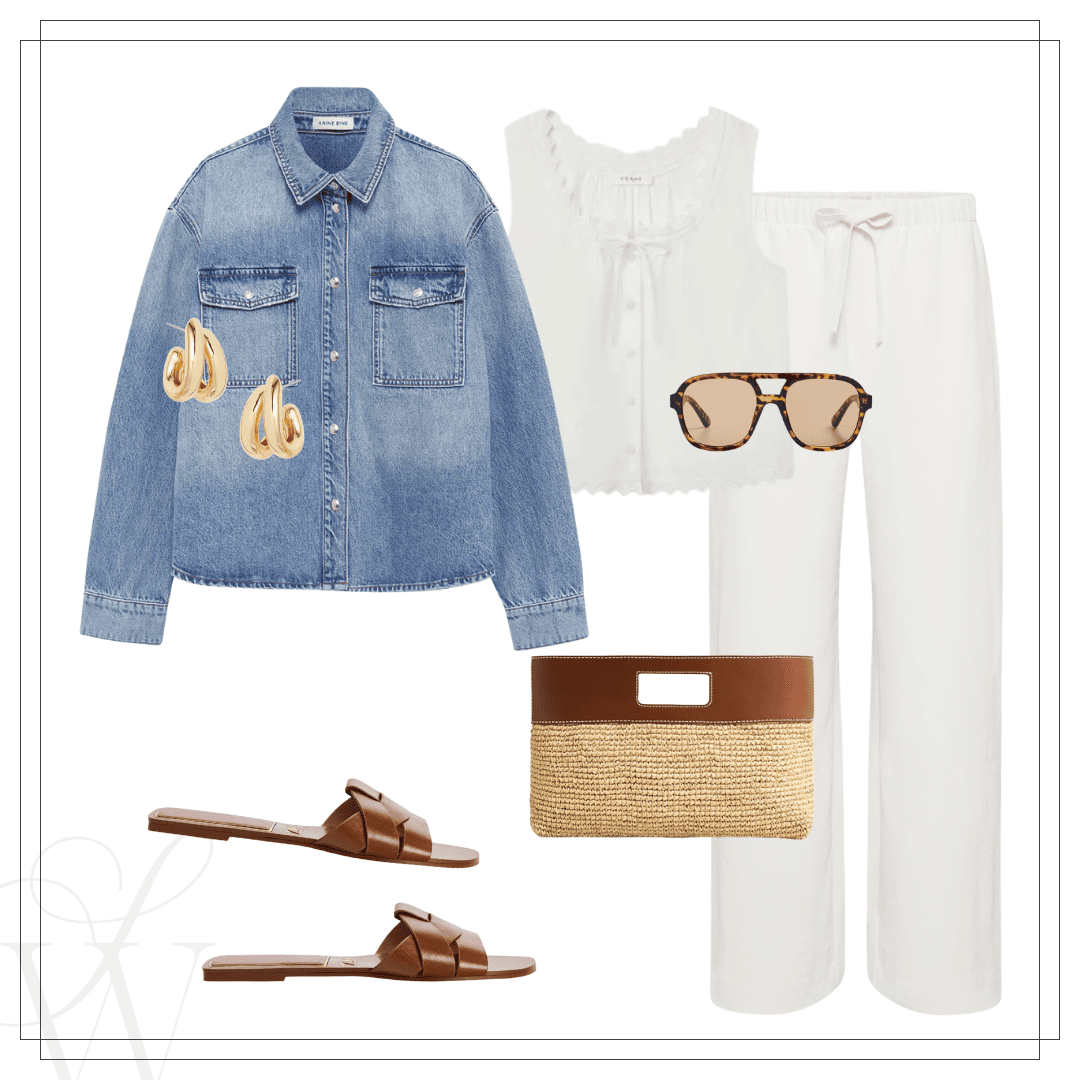 Left: Denim shirt | White jeans | Gold sandals | Right: Anine Bing shirt | Lodge pant | Zara sandals | J.Crew clutch | Frame top