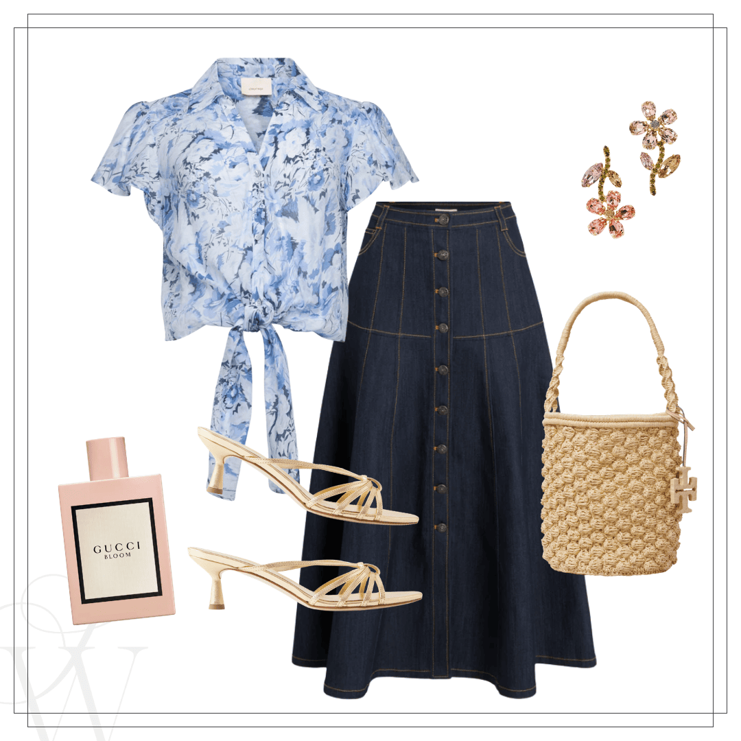 Left: Denim jacket, similar | White skirt, similar | Right: Blue floral blouse | Denim skirt | Sandals | Raffia bag | Earrings