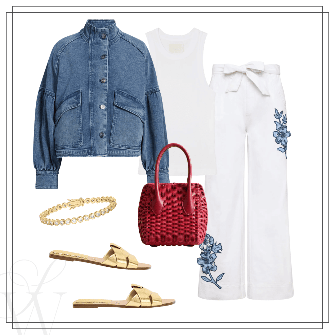 Left: Frame denim jacket | White jeans | Savette bag | Right: Denim jacket | White floral jeans | Gold sandals | Red bag